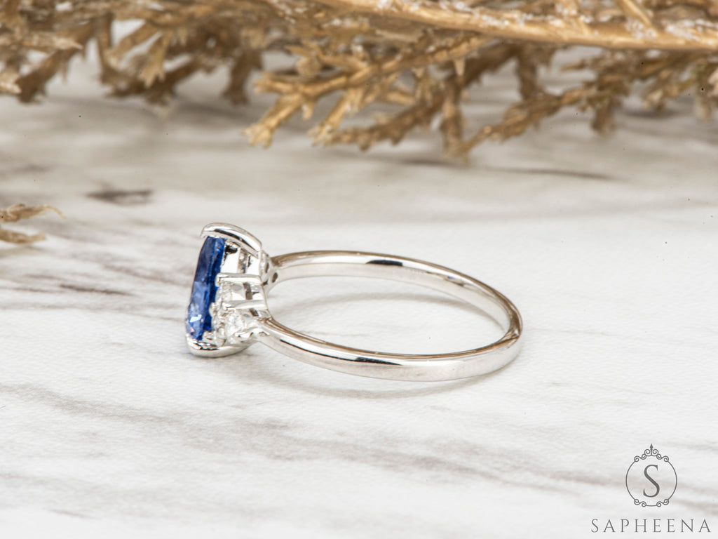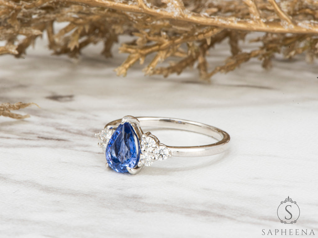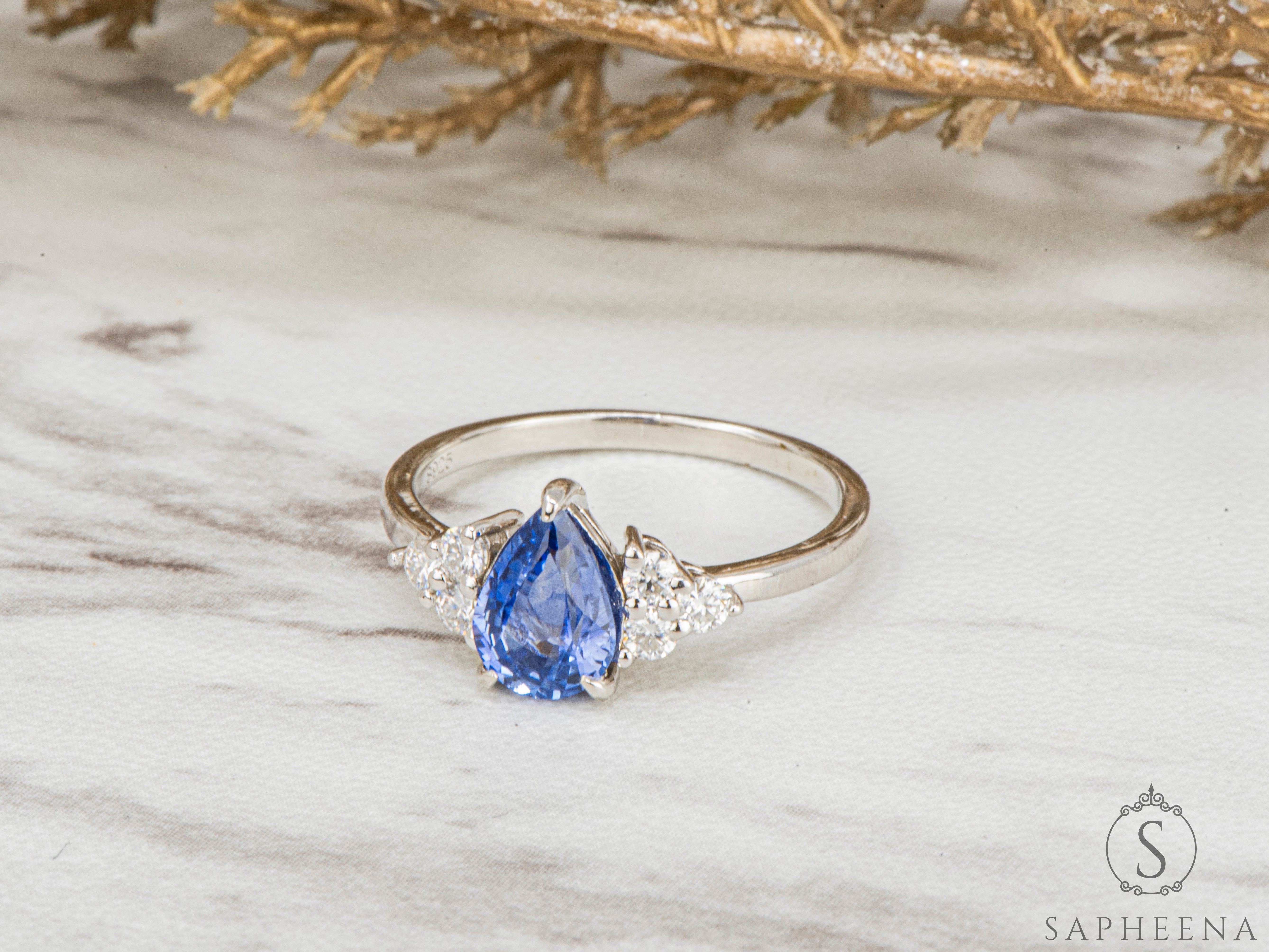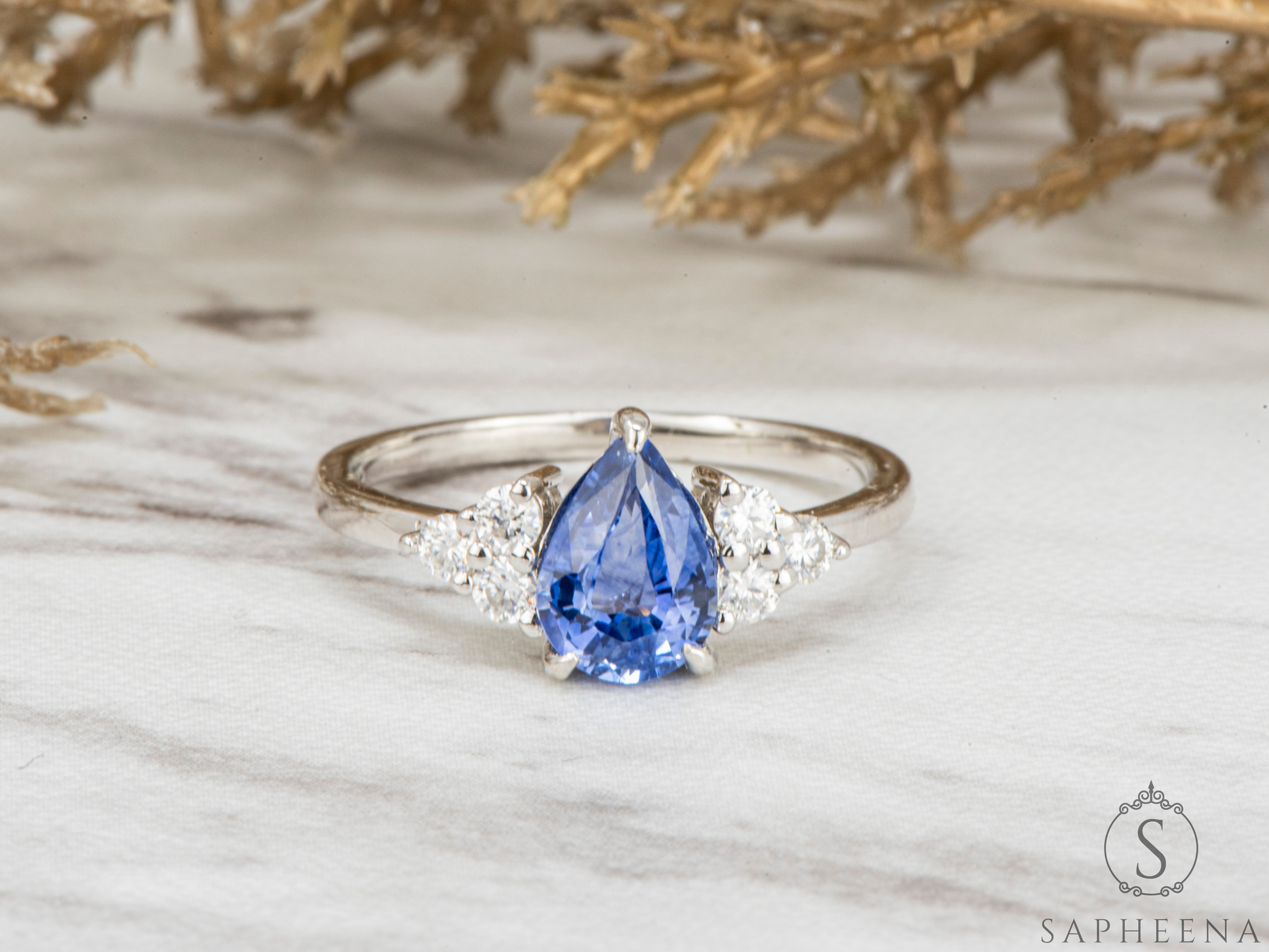 Add timeless beauty to your collection with this Lavender Blue Sapphire Ring by Sapheena. Featuring an elegant natural sapphire and diamond ring design, it showcases a pear-cut lavender blue sapphire set in white gold with sparkling lab or natural diamond cluster. This sapphire ring is perfect for engagements, anniversaries, or a unique gift for her.