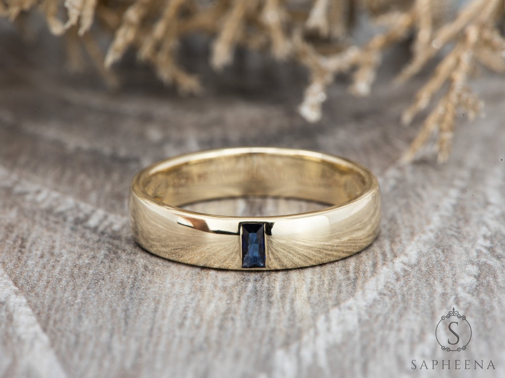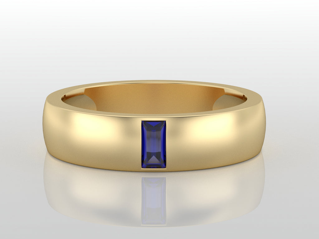 This sleek baguette cut ring features a single blue sapphire, bezel-set in a solid gold band. Its minimalist and modern design makes it a timeless wedding band or everyday ring. A refined piece that combines elegance with understated sophistication.