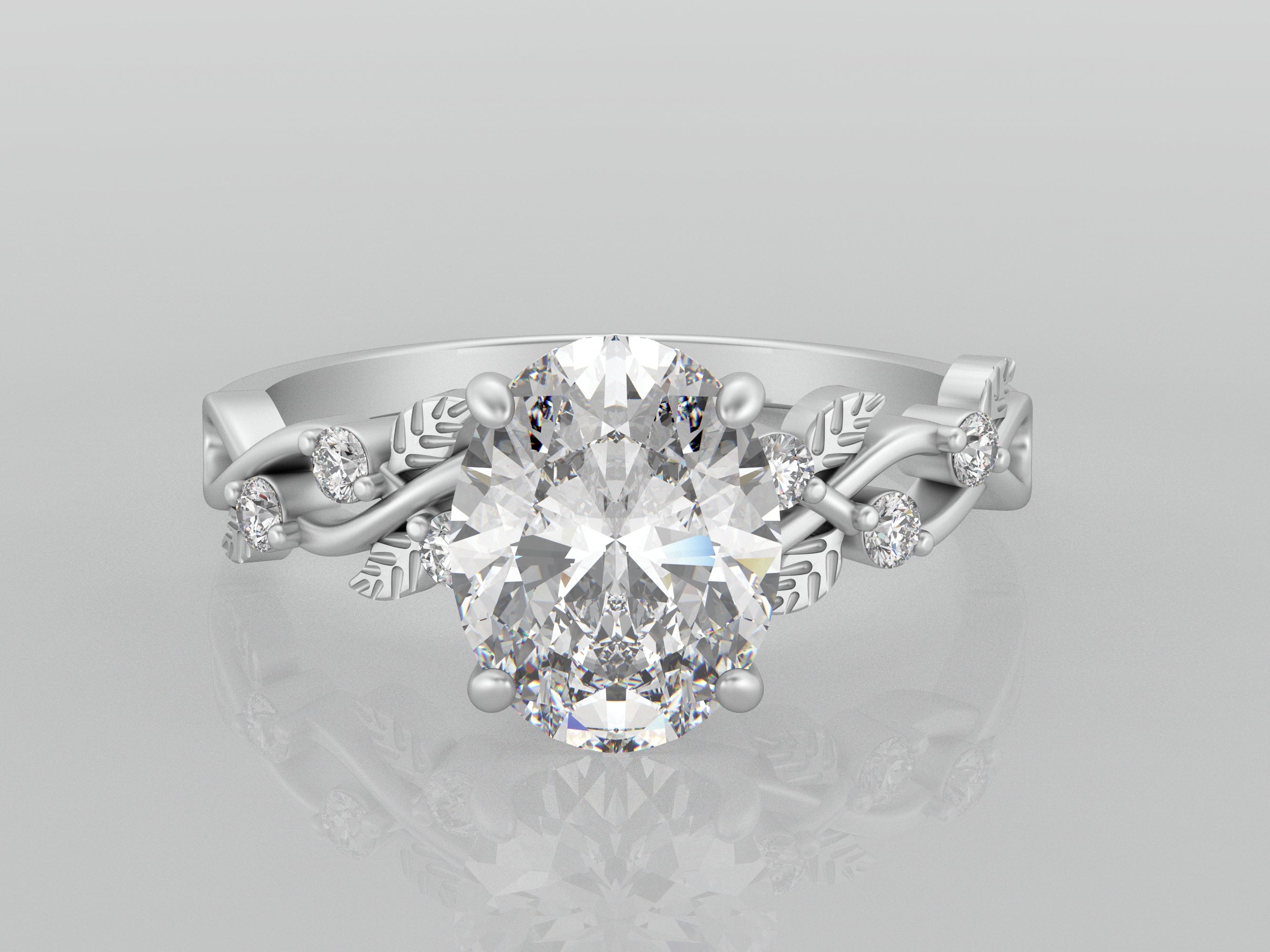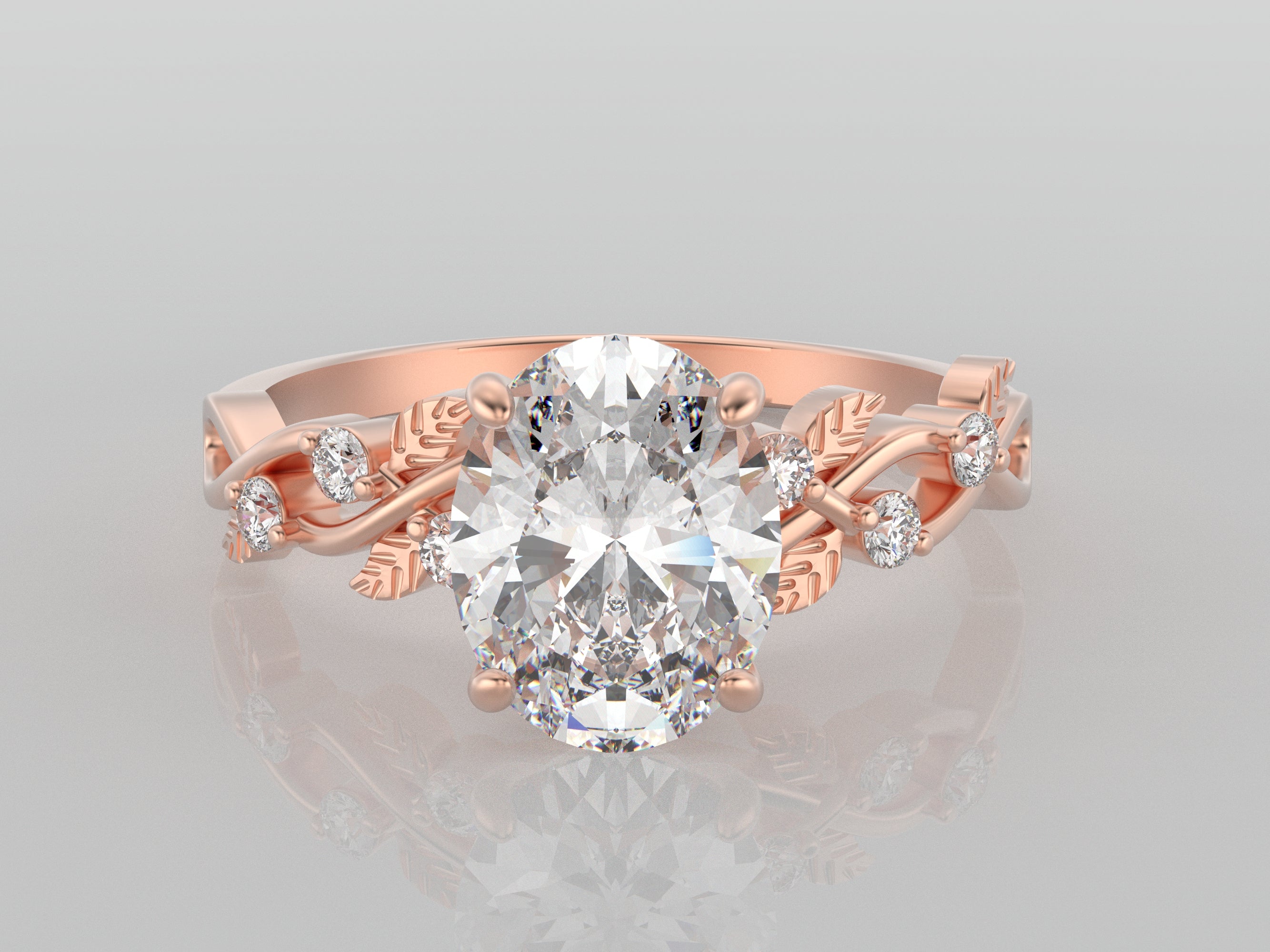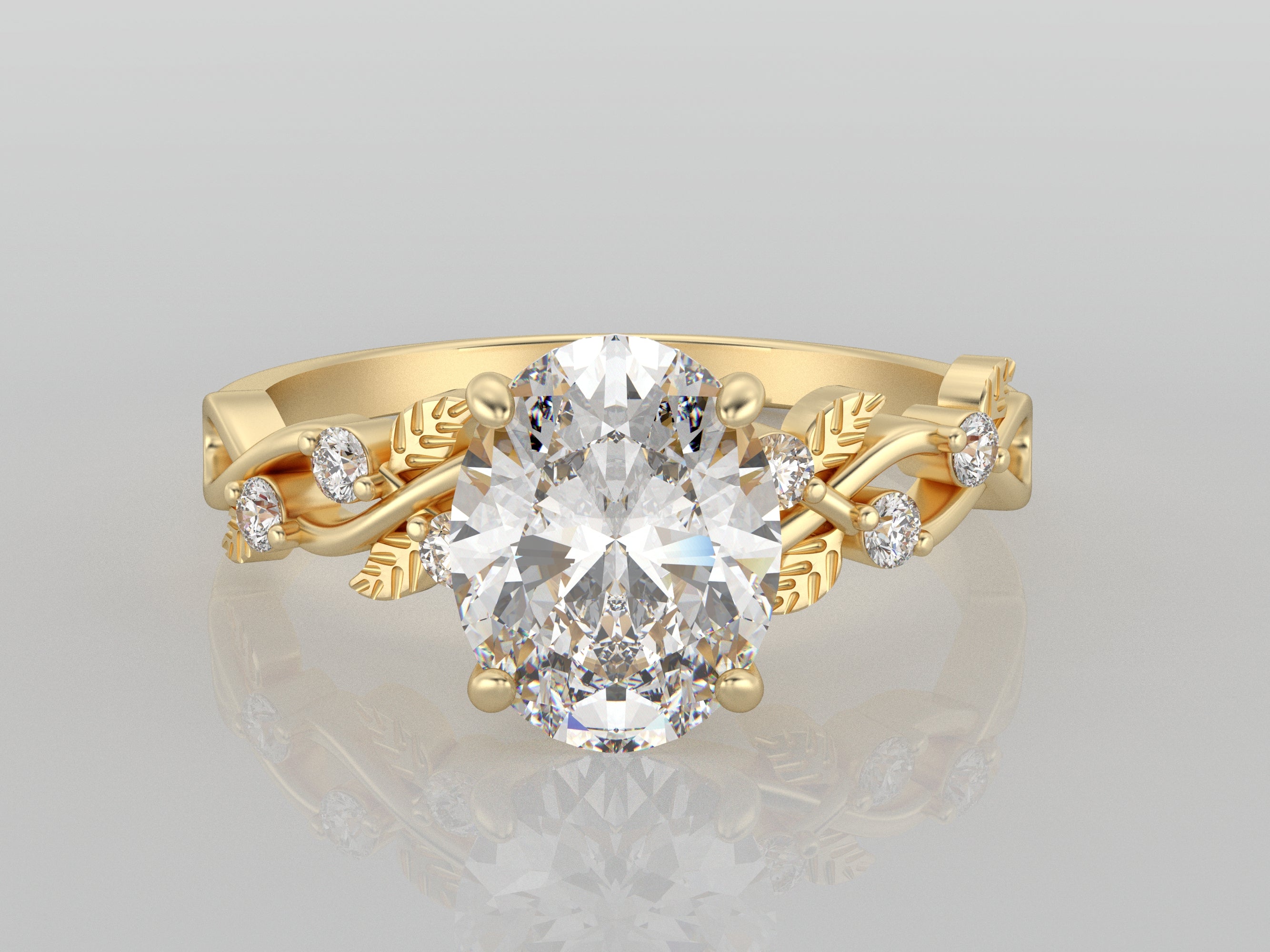 Inspired by nature, this enchanting engagement ring features a oval-cut moissanite or lab-grown diamond, elegantly set in solid gold. The intricate leaf and vine design is adorned with sparkling accent stones, creating a whimsical, vintage-inspired look. A perfect choice for nature lovers and brides seeking a unique, timeless piece.