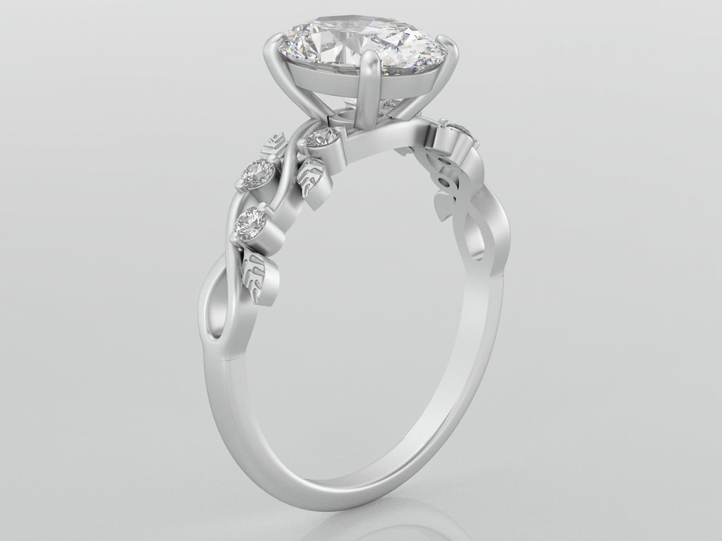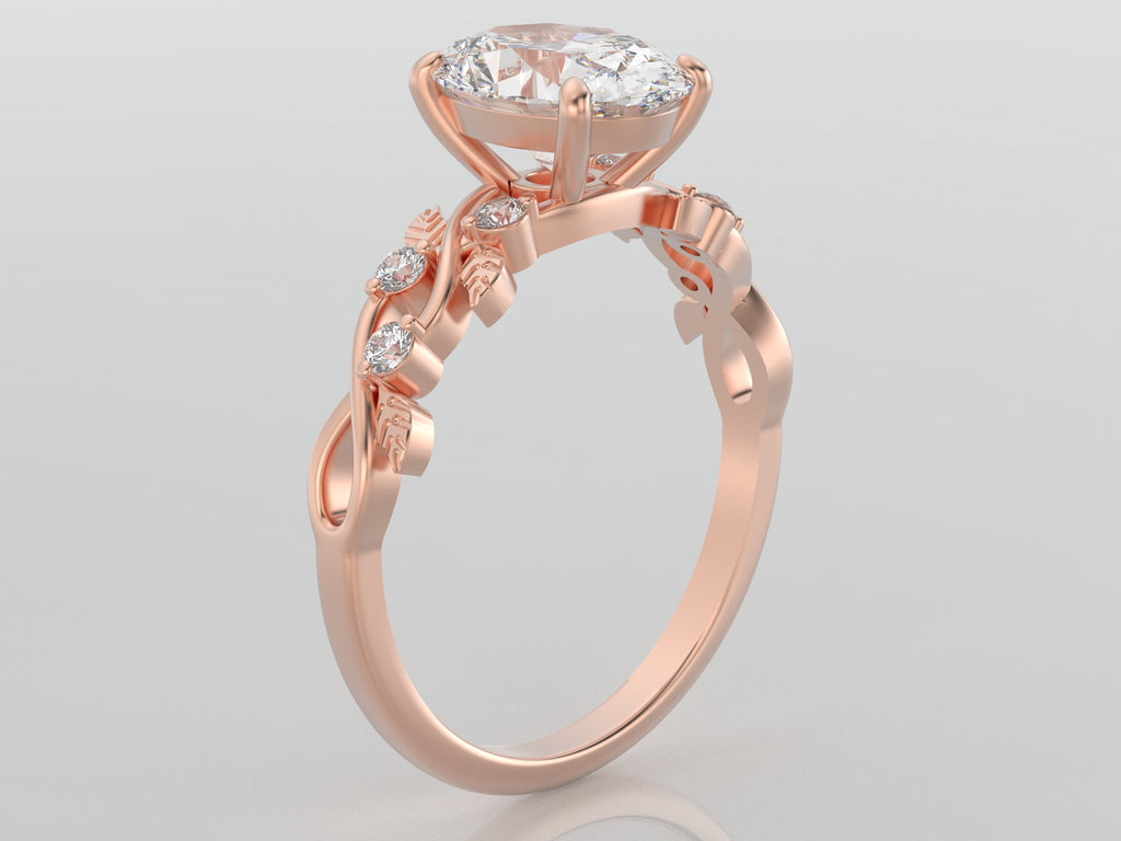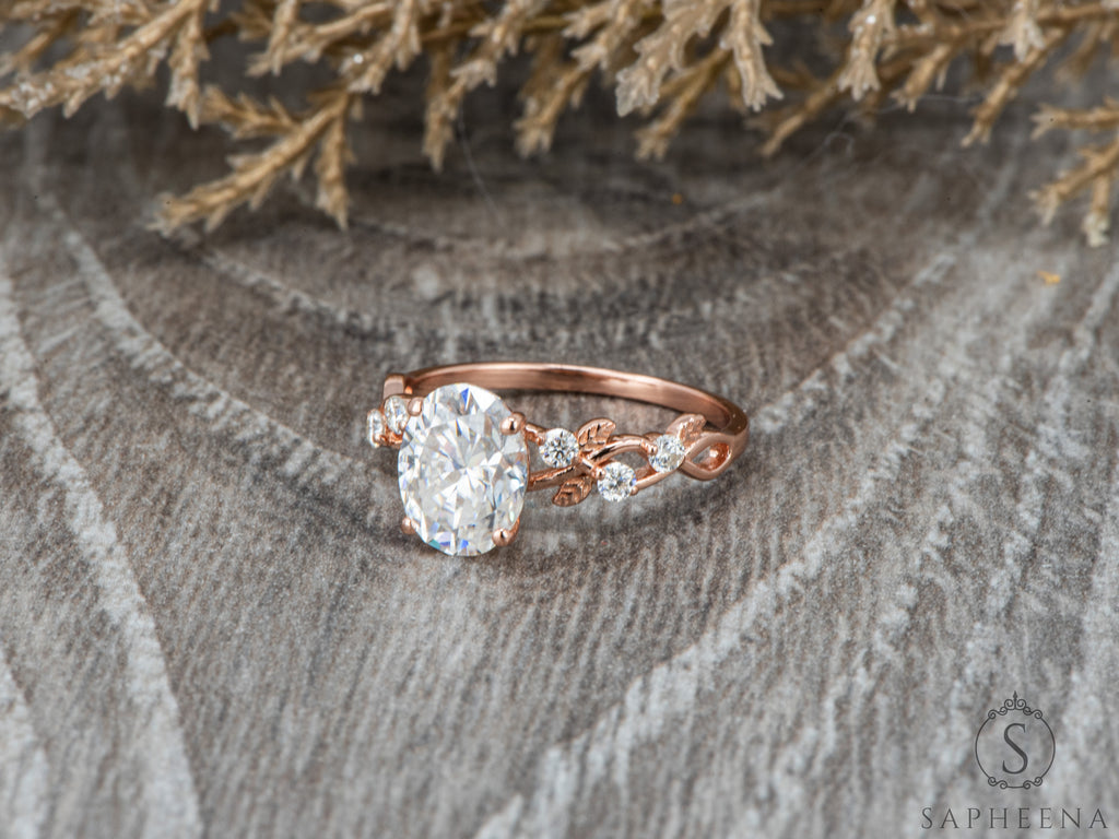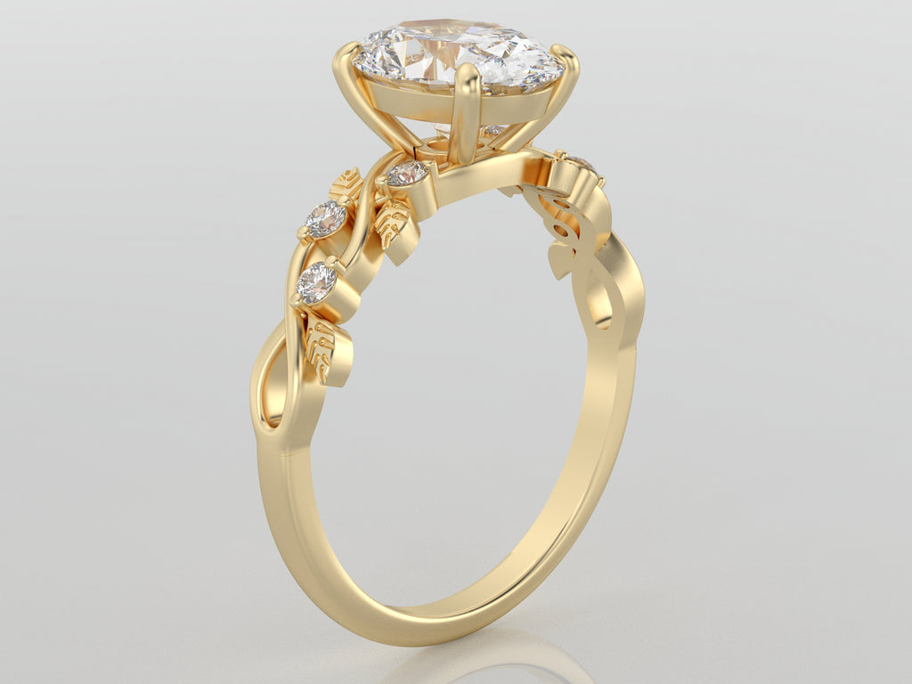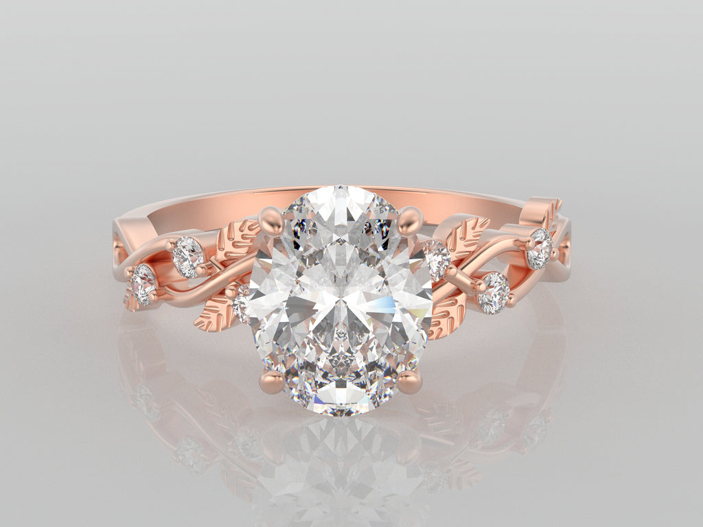 Inspired by nature, this enchanting engagement ring features a oval-cut moissanite or lab-grown diamond, elegantly set in solid gold. The intricate leaf and vine design is adorned with sparkling accent stones, creating a whimsical, vintage-inspired look. A perfect choice for nature lovers and brides seeking a unique, timeless piece.