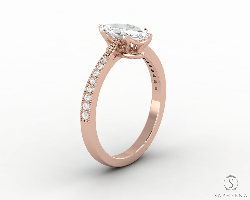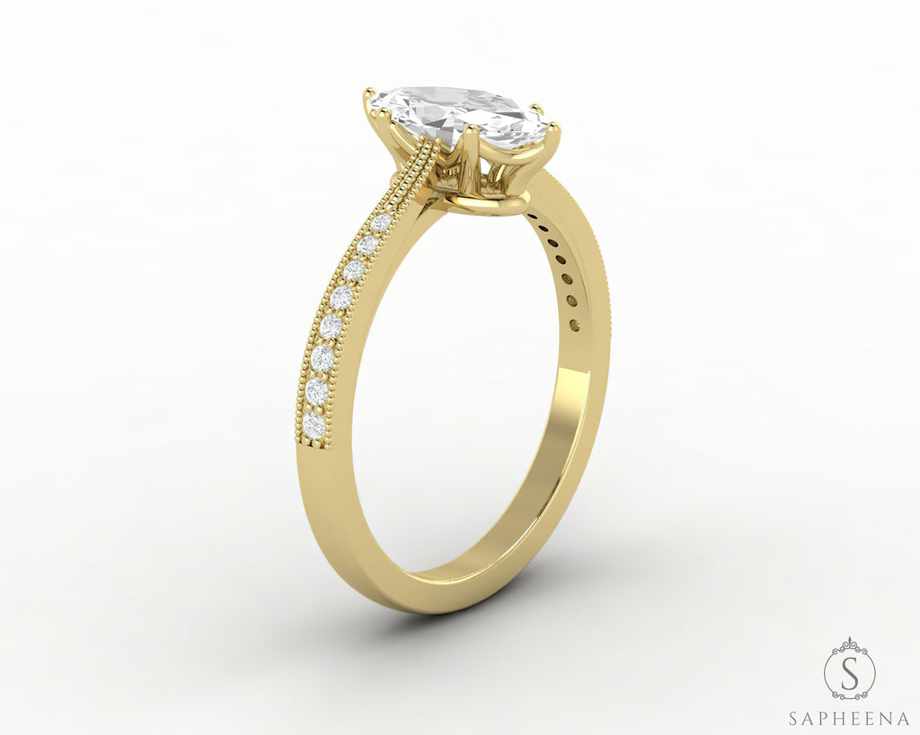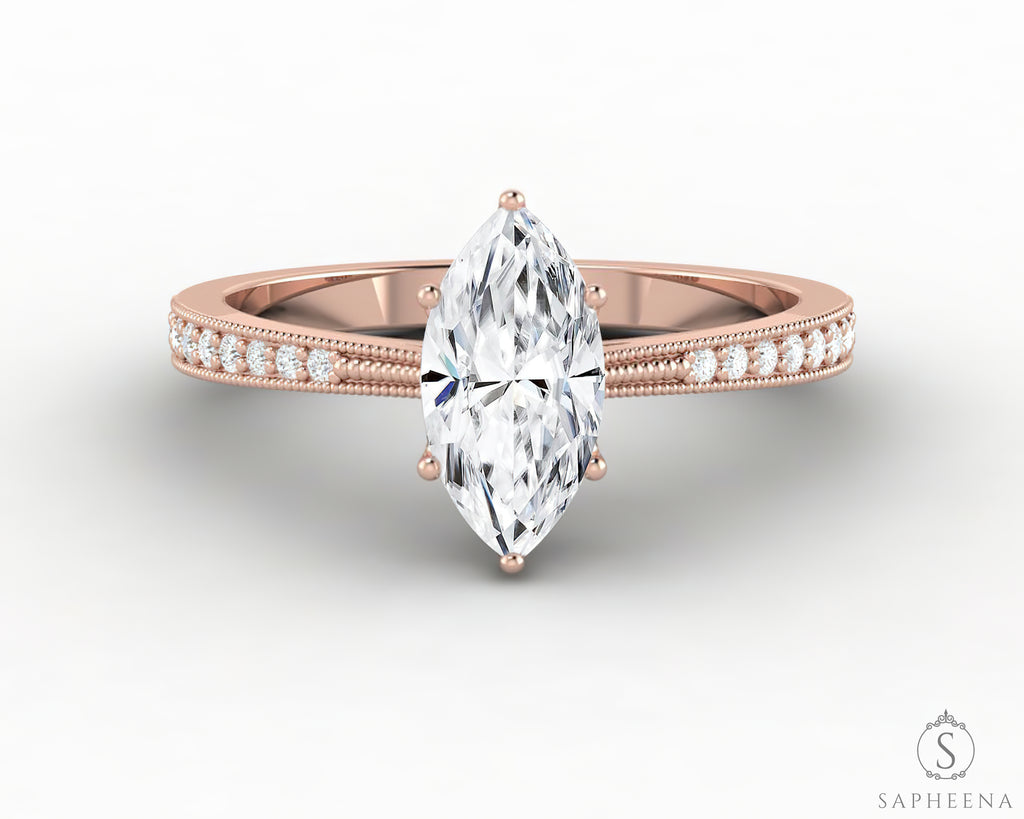 This 1 Ct marquise cut engagement ring features a lab-grown diamond center stone, set in solid gold with side stones and milgrain detail on the shank. A vintage-inspired gold ring that’s perfect as a unique engagement ring or anniversary gift.