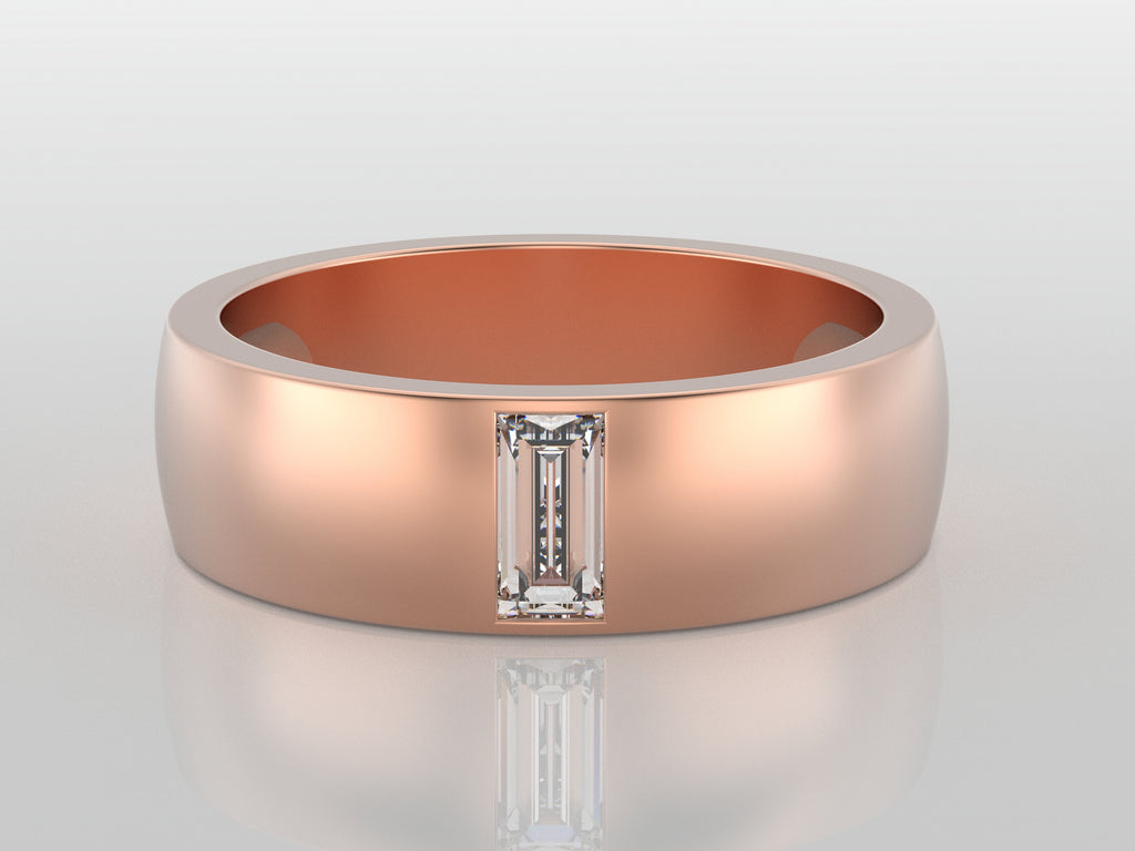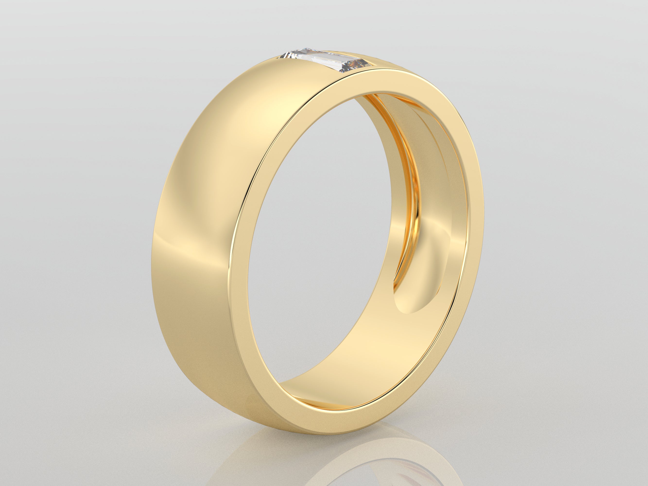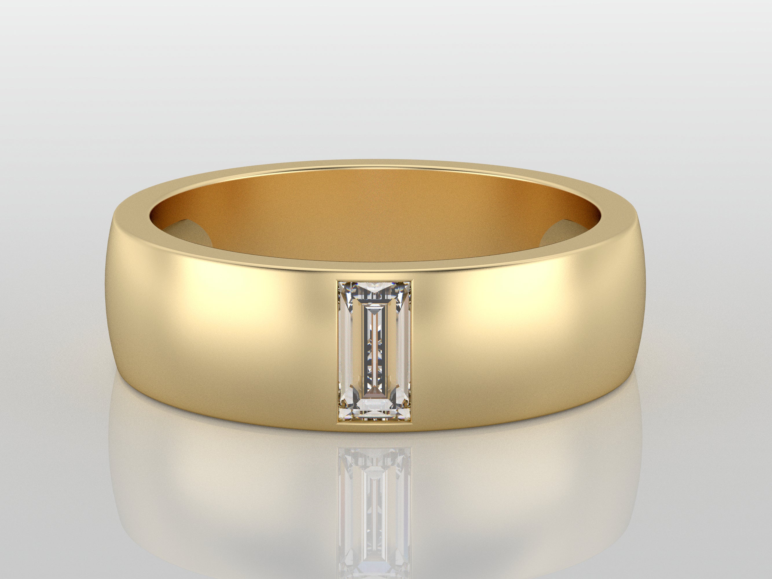This sleek baguette cut ring features a single moissanite or lab-grown diamond, bezel-set in a solid gold band. Its minimalist and modern design makes it a timeless wedding band or everyday ring. A refined piece that combines elegance with understated sophistication.