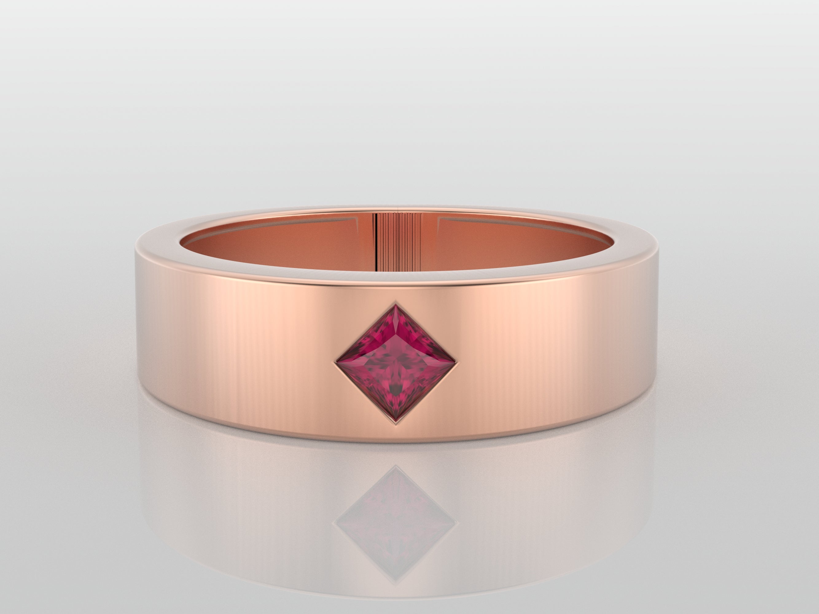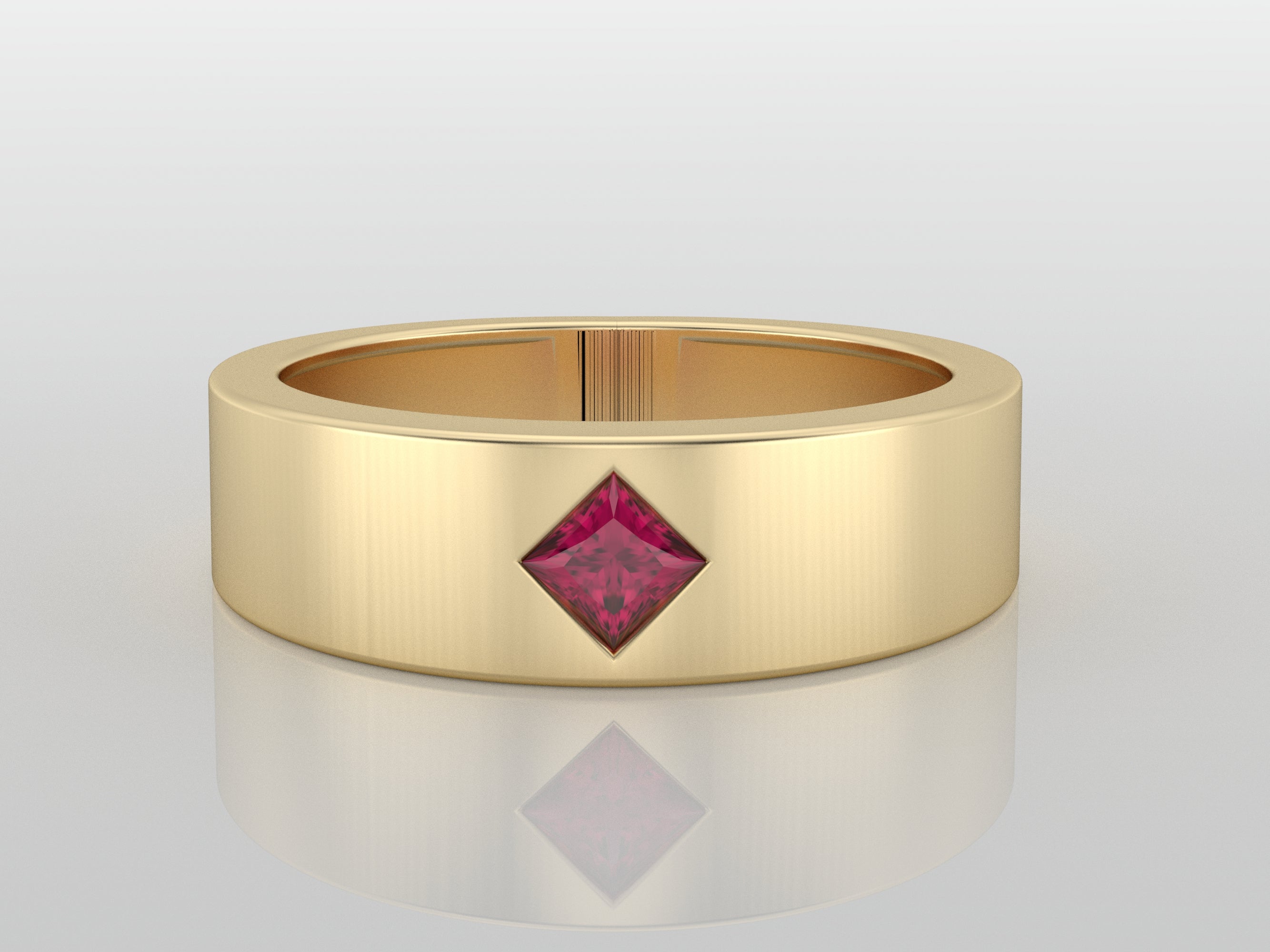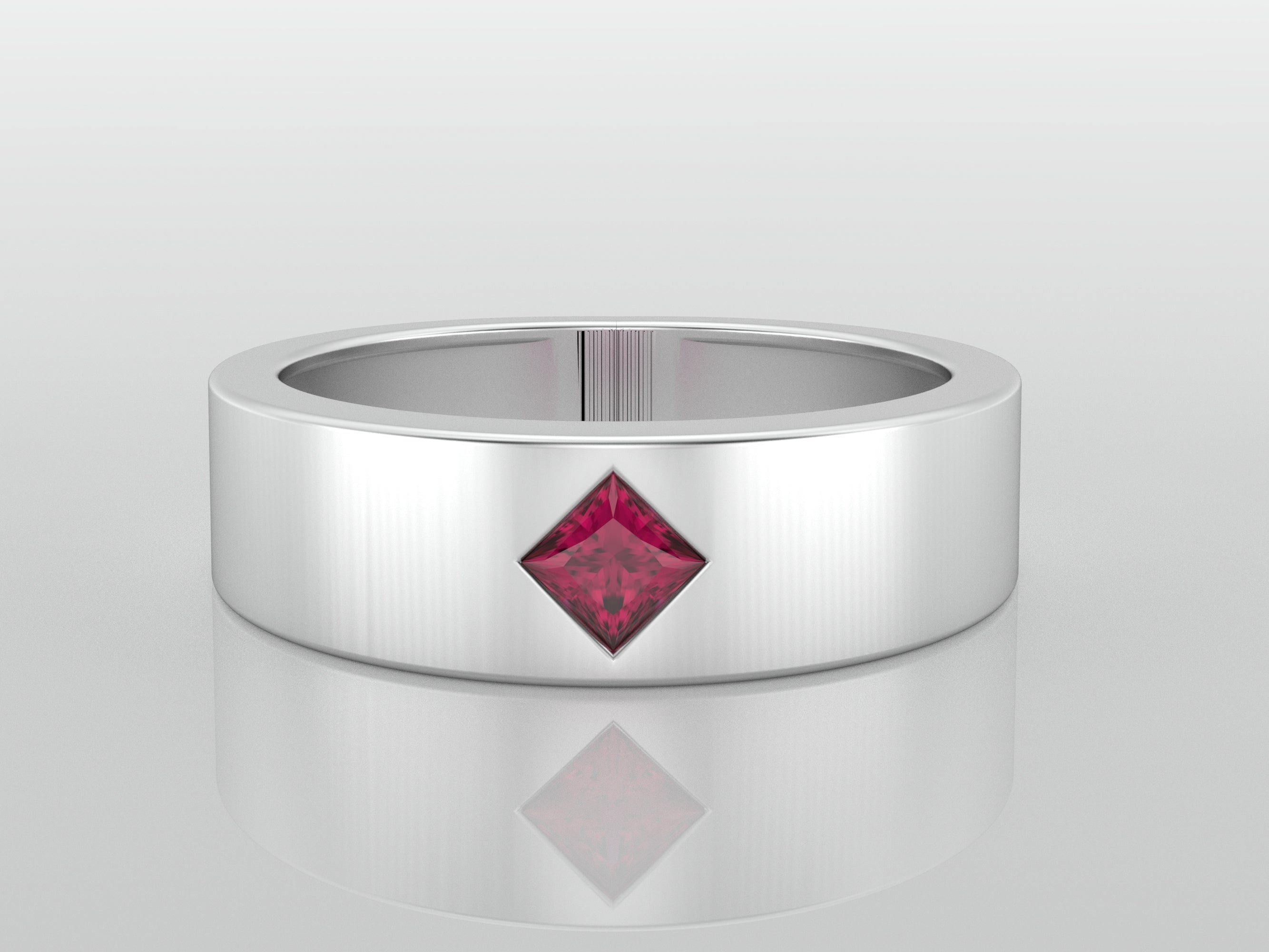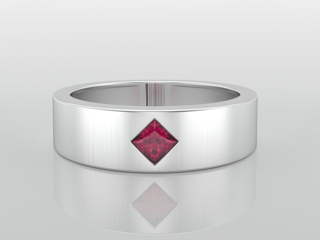 This sleek band features a brilliant princess-cut ruby elegantly set at the center in a diagonal orientation, offering a modern touch to its classic design. Available in luxurious gold or platinum, this band combines timeless style with contemporary elegance, making it a perfect choice for those seeking sophistication in simplicity.