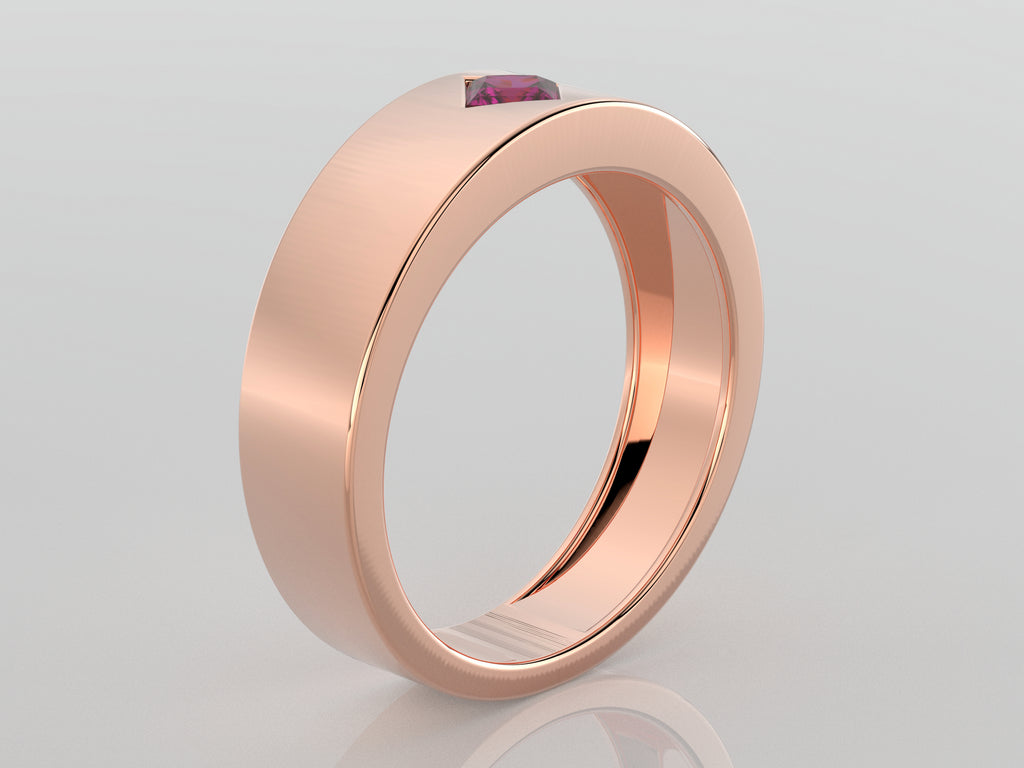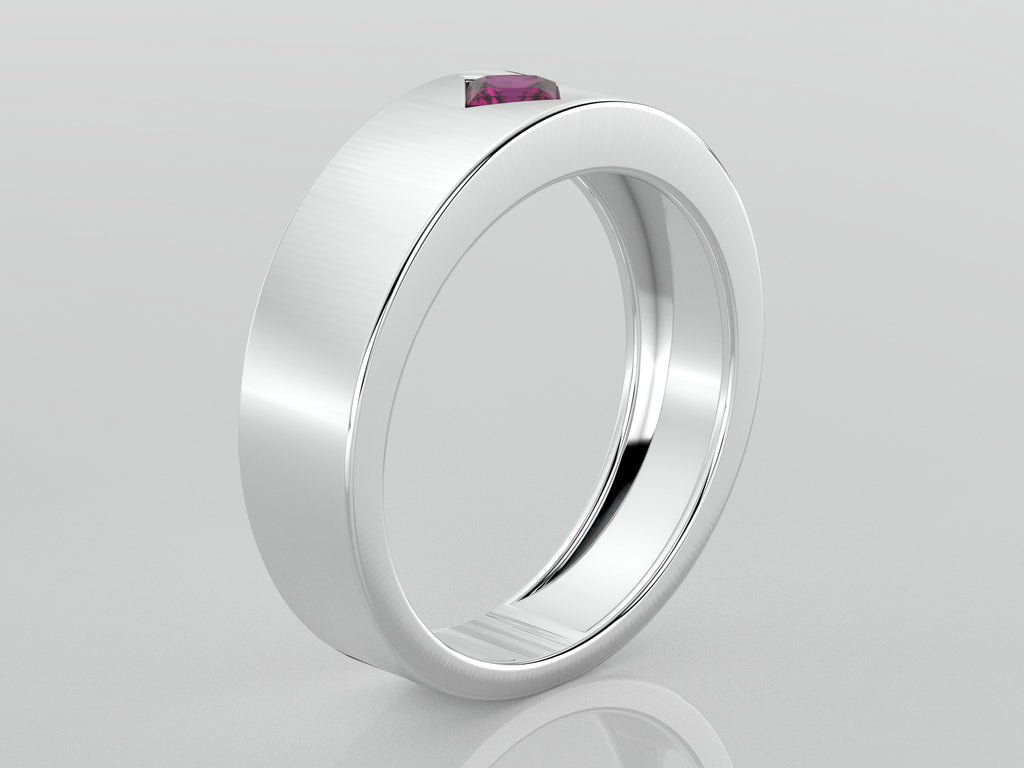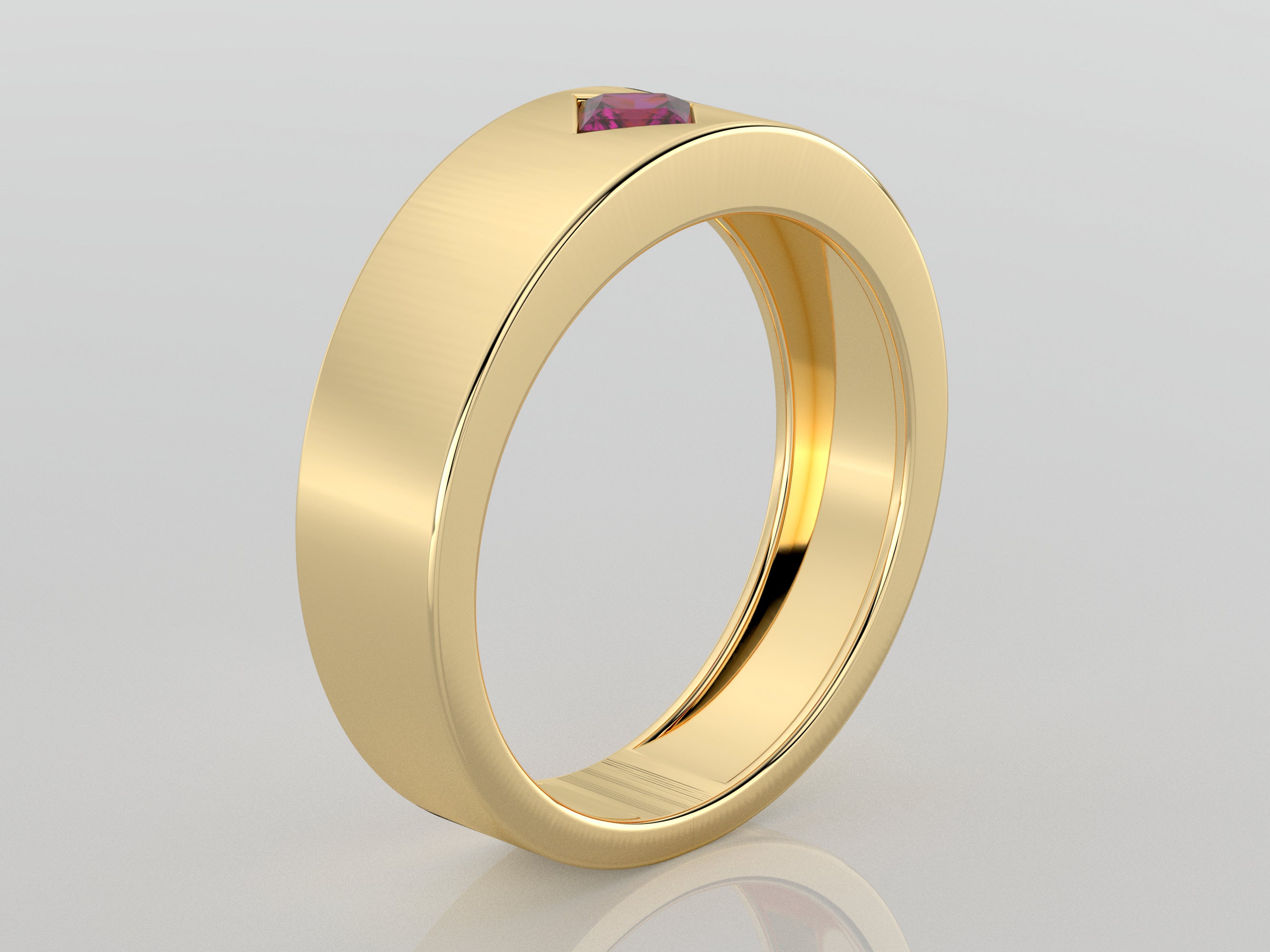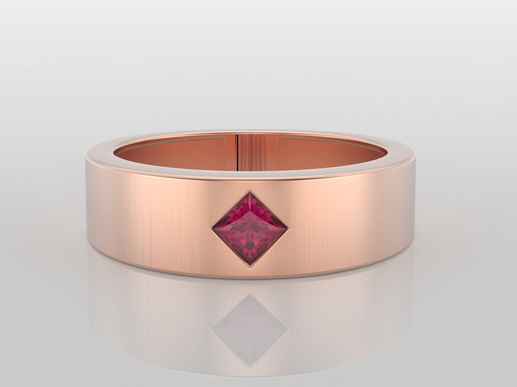This sleek band features a brilliant princess-cut ruby elegantly set at the center in a diagonal orientation, offering a modern touch to its classic design. Available in luxurious gold or platinum, this band combines timeless style with contemporary elegance, making it a perfect choice for those seeking sophistication in simplicity.
