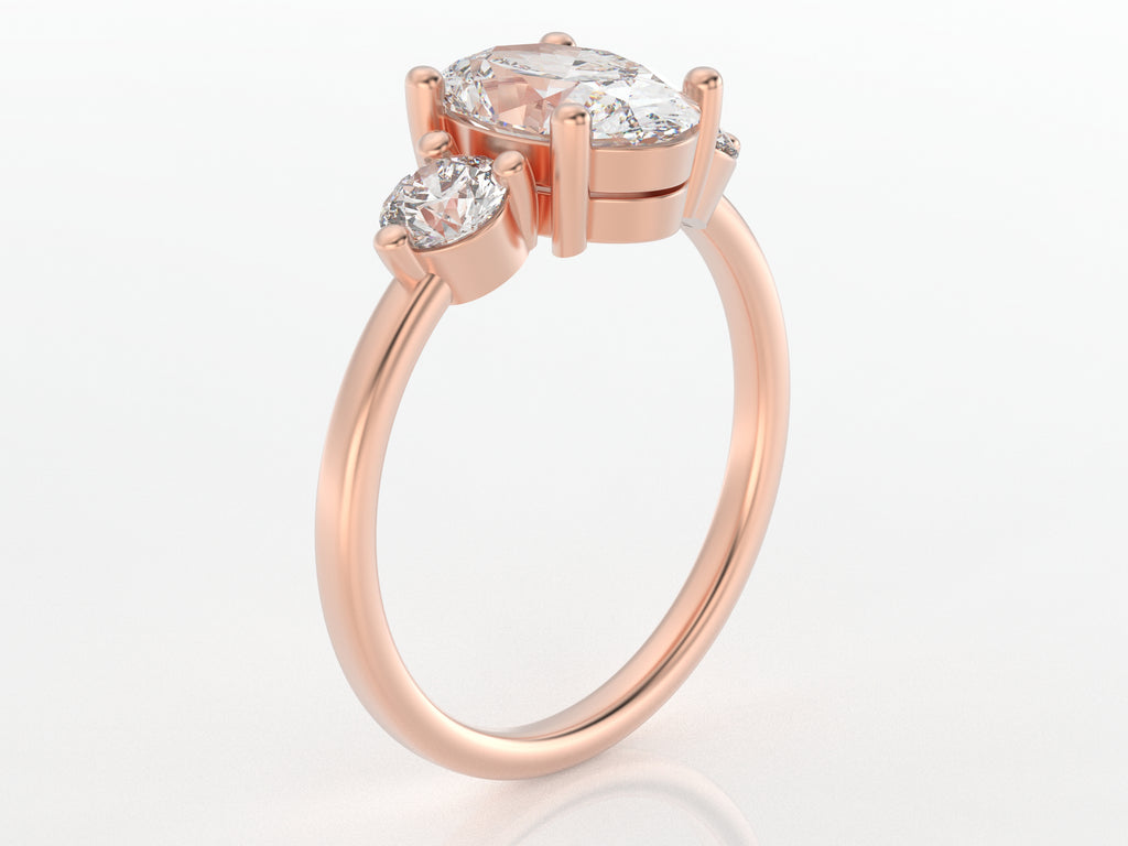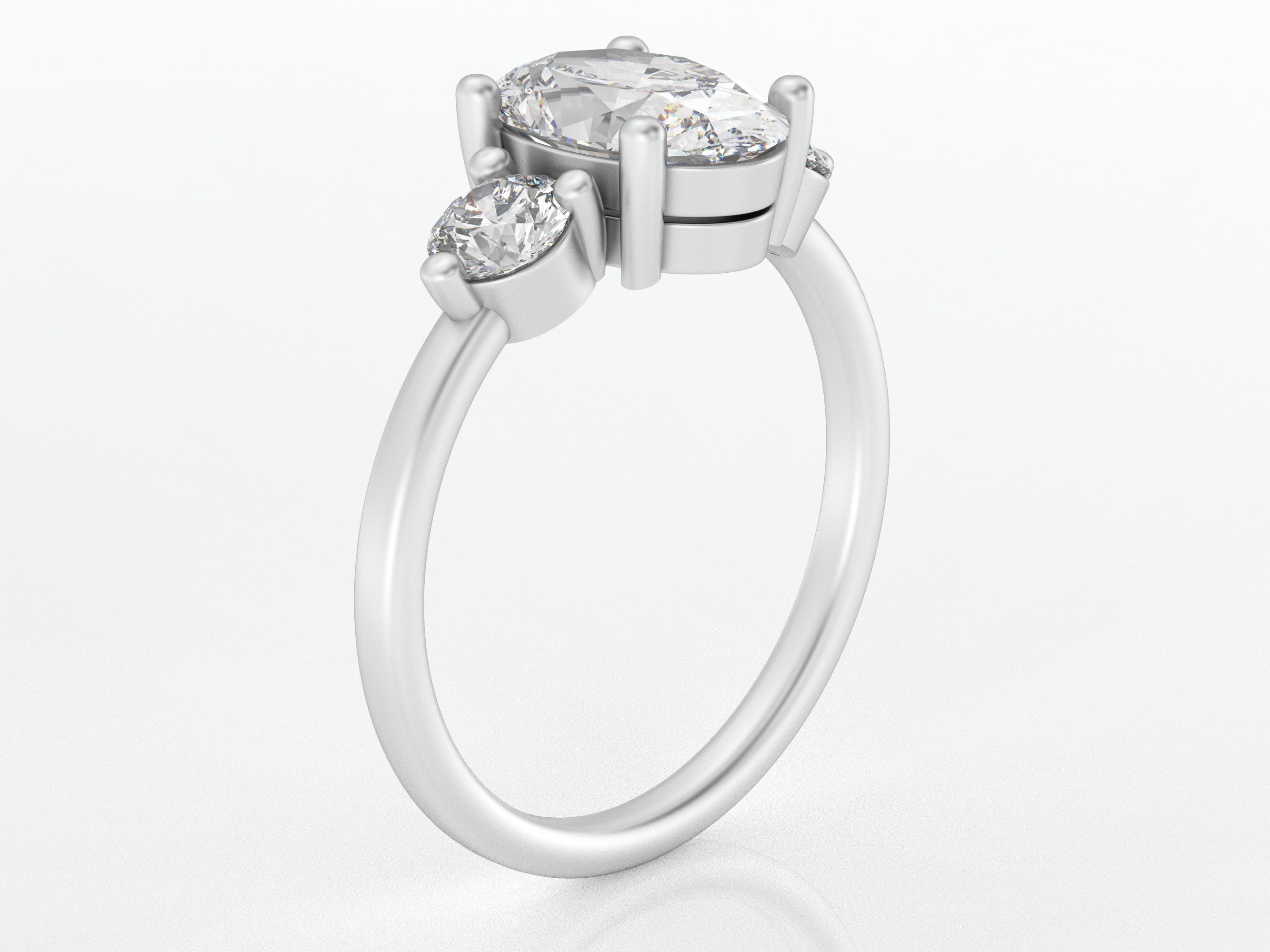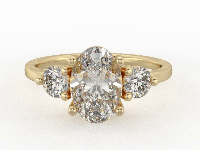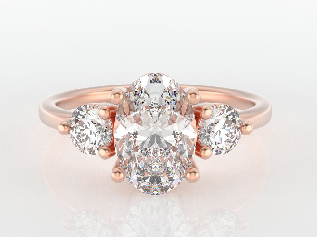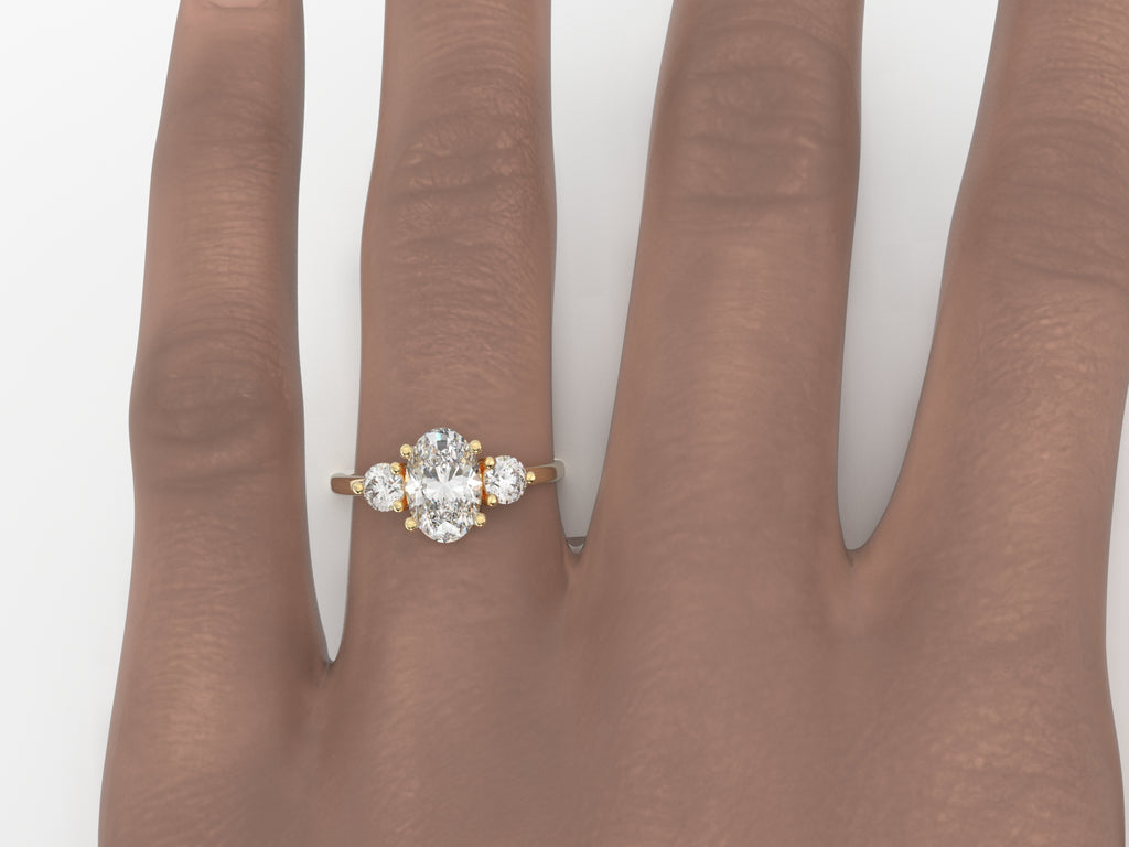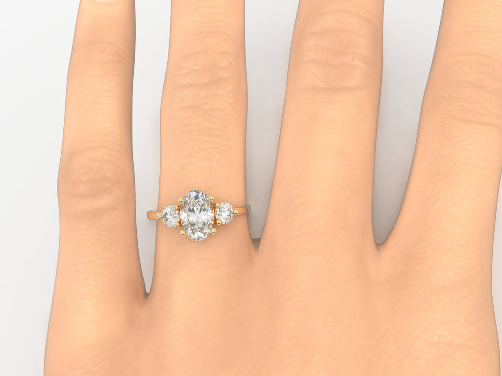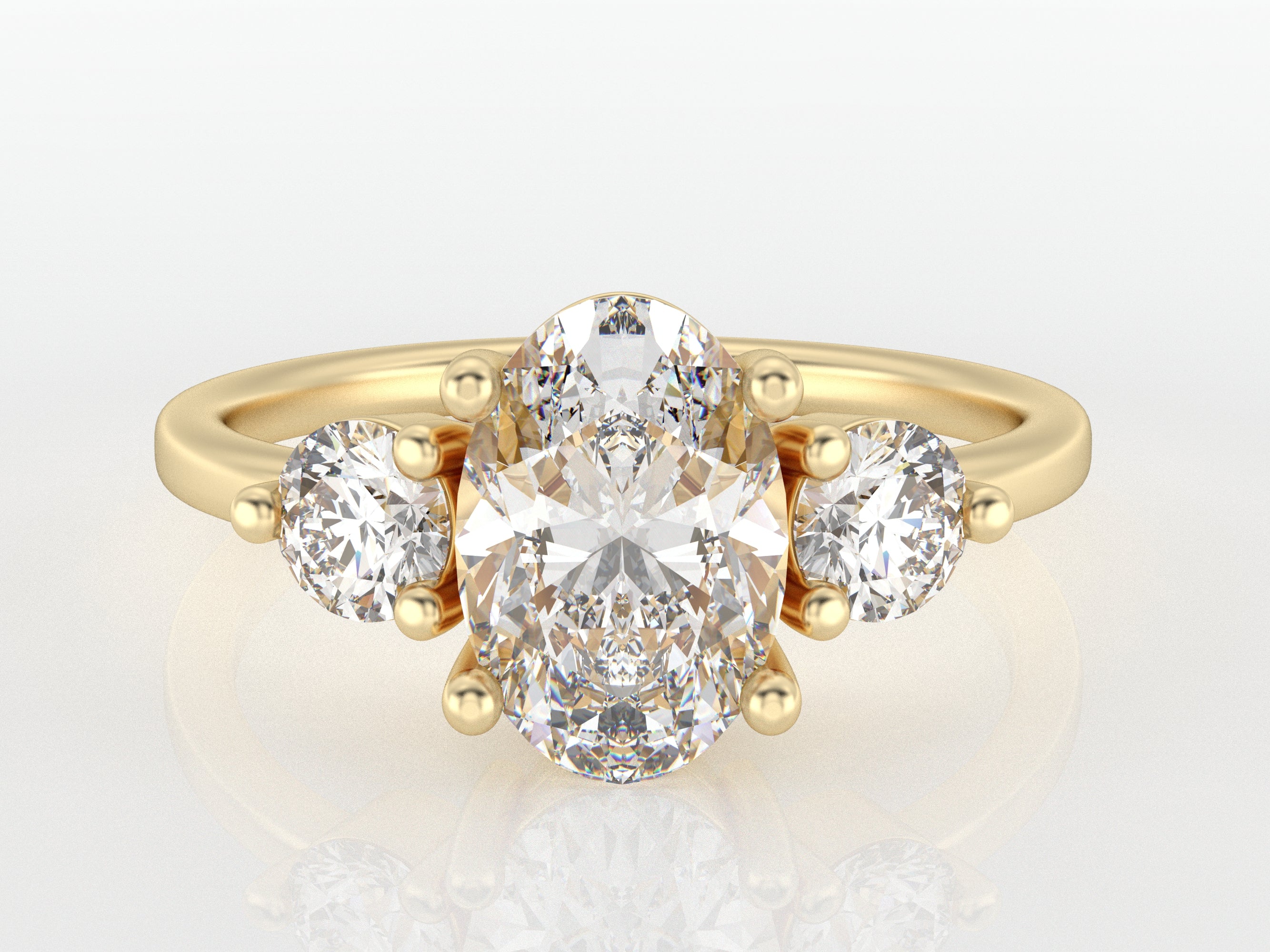A timeless three-stone engagement ring featuring a 1.5 Ct oval cut lab-grown diamond at the center, flanked by two matching lab-grown side diamonds. Crafted in solid gold, this elegant setting symbolizes the past, present, and future—perfect for celebrating enduring love.