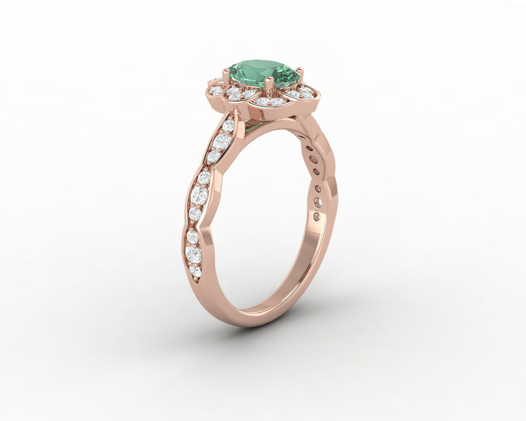 A vintage inspired engagement ring that features a brilliant oval cut Natural Green Sapphire center stone with a unique diamond halo and scalloped band made in solid 14k rose gold.