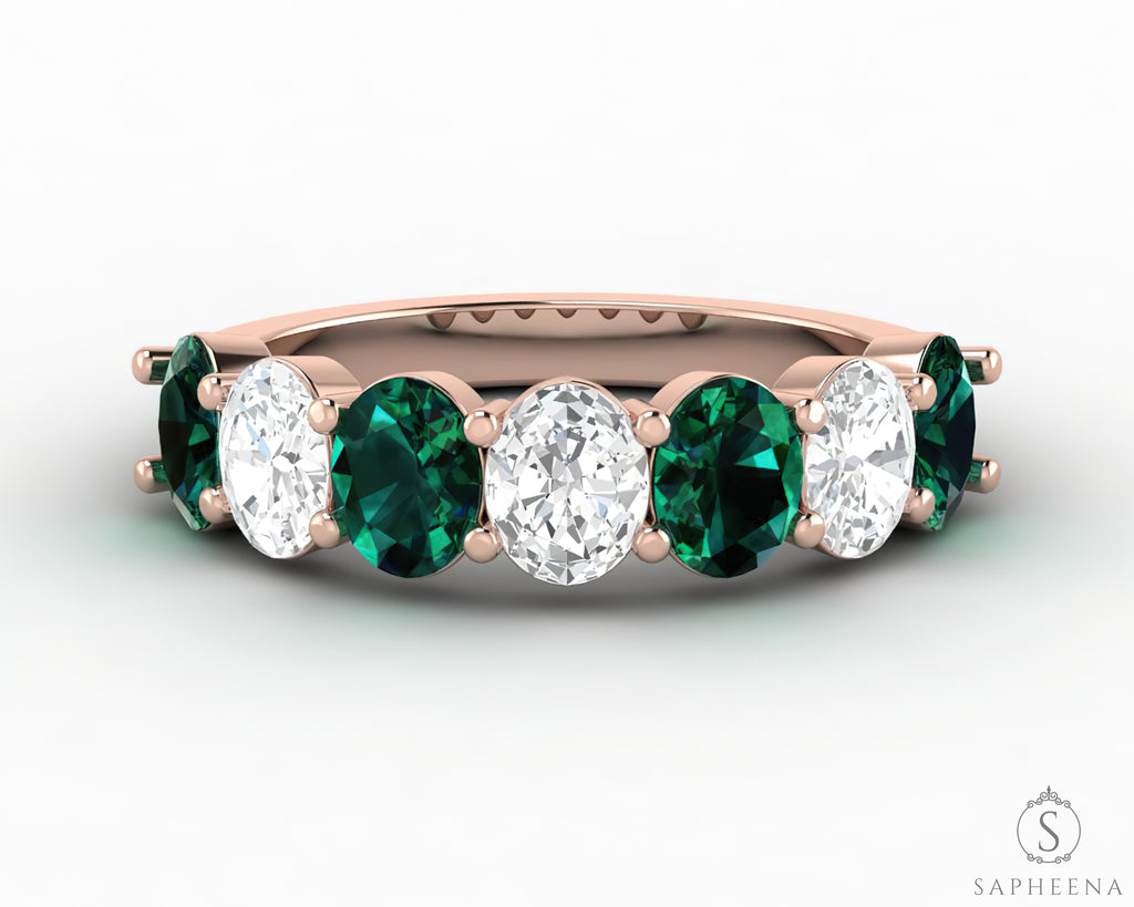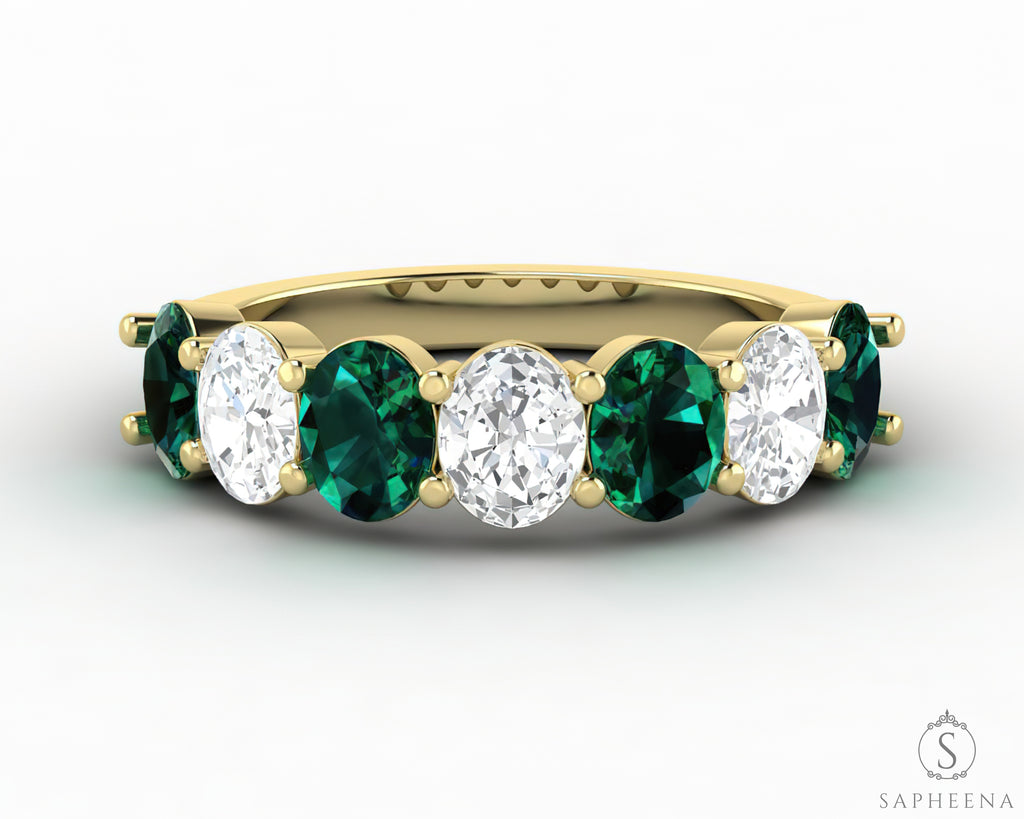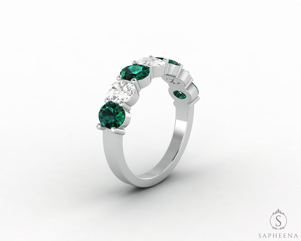 Ivy 2.5 Ct Oval Cut Moissanite and Green Emerald Half Eternity Wedding Band